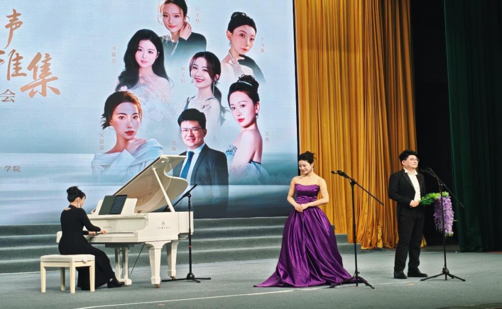 演出中,刘文娟老师展现了全面的艺术修养与多元的演唱风格。她独唱的创作歌曲《边境的小鸟》,情感真挚、旋律优美,表达了对自然与生命的深切关怀;随后演绎的中国古诗词艺术歌曲《槛菊愁烟兰泣露》,以典雅含蓄的演唱,将古典诗词的意境与声乐艺术完美结合,彰显了中华传统文化的深厚底蕴。在与嘉宾合作的环节中,她参与的男女二重唱《紫藤花》(选自歌剧《伤逝》),深情婉转,展现了角色内心的细腻情感;女声二重唱《梨花又开放》则清新悠扬,寄托了对美好生活的向往与歌颂。